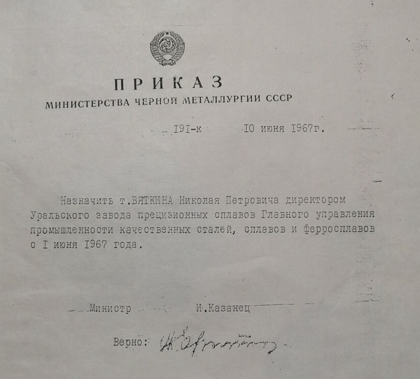 В шестидесятые годы страна буквально «заболела» космосом. С развитием радиоэлектроники, телемеханики, космической и медицинской техники росла потребность страны в сверхточных, прецизионных сплавах. Было принято решение построить на Урале специализированное предприятие с полным металлургическим циклом. В 1967 году Николай Петрович Вяткин был назначен директором Уральского завода прецизионных сплавов. Завод предстояло создать с нуля.